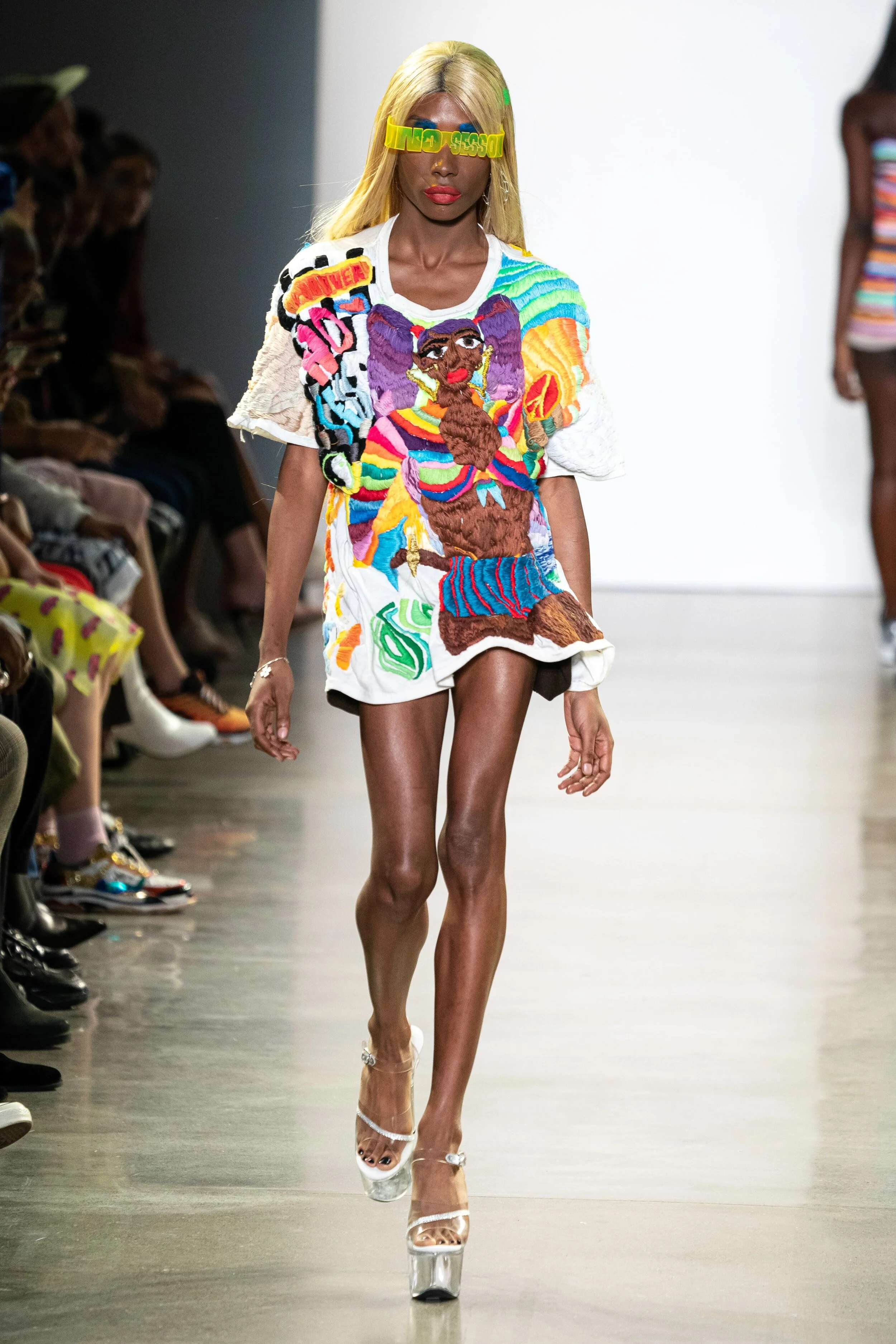 No Sesso Founder Pierre Davis and her co-director Arin Hayes further widened the scope of the No Sesso label with an exuberant and vivacious new collection, titled “I'd Rather Rescue Myself”. After a troubling incident at a Pride event earlier this year where both Davis and her stylist were harmed, the show felt like a proclamation of renewed life. Following extensive Insta-casting, the runway was populated by people of colour of all gender identities and body shapes. “This show is dedicated to every BLACK trans sister who has walked this earth, dead or alive. “I’d Rather Rescue Myself” is for US. If you know, you know. EVERY BLACK FEMME ON PERIOD”, Davis wrote in a statement. Moving the needle from the label’s usual high-concept pieces, often one of a kind, SS20 geared towards scalability and increased daily wearability – by releasing airbrushed tees, logo two-pieces and boxy jackets down the catwalk. The No Sesso signature superhero motif paired with the neon logo visors, logo templates sprayed onto the models’ hairdos and hand-dyed oversize ensembles felt like an affirming disclaimer of presence. No Sesso is to be known worldwide, seems to be the motto, and you can only wish the trailblazing label well.