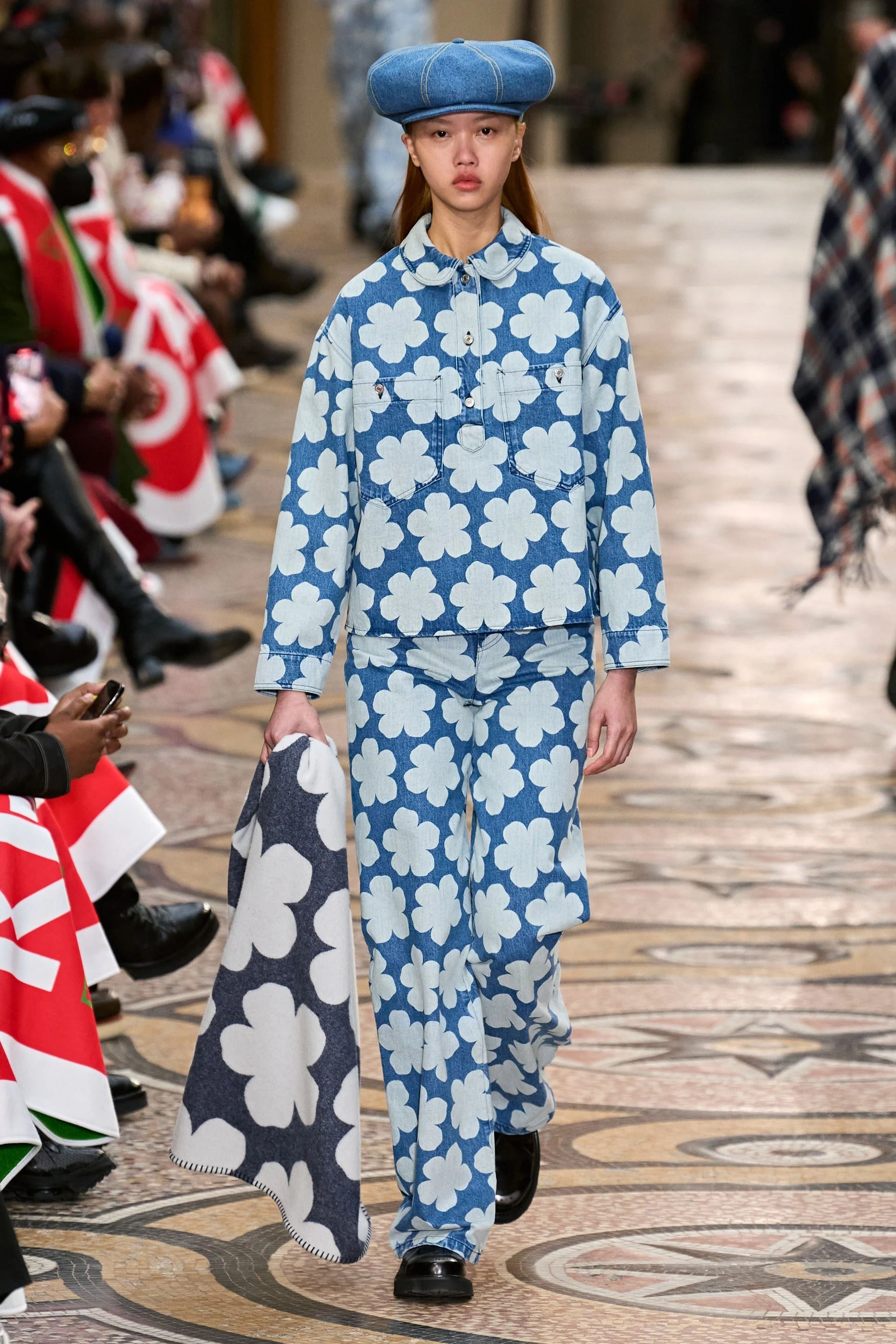 Placing one of the foremost contemporary Japanese designers at the helm of Kenzo, after founder Kenzo Takada’s passing in 2020, is only the latest in a series of whipsmart LVMH picks and taps. The show was much-anticipated and served as a few-frills first foray into Nigo’s take on the youthful, positive and polychromatic essence of Kenzo. The legendary BAPE founder and cultural connector chose to hone in on floral denim for winter (resist a Miranda Priestly riposte here, please), original hand-drawn Kenzo sketch prints and reworked archive silhouettes. The foremost Kenzo hallmark, the poppy print, swole and shrunk in various permutations. Military influences gave the models an air of being proud foot soldiers of the new wave, sporting K medals and bulging berets with a ‘1970’ logo. The midcentury collegiate silhouettes that Kenzo Takada popularized in the 80s were re-established by Nigo in rich hues of burgundy and buttercup, followed by intarsia knits and great bombers. A personal highlight was the extremely elegant flip on the signature BAPE camo via a khaki floral print but I can’t pretend the front row wasn’t an equally major draw. For posterity, I will note Julia Fox wore conic-busted Schiaparelli denim and Pharrell posed in controversial Tiffany collab emerald-studded sunnies. Tyler, the Creator repping Golf le Fleur* and Pusha T proved that, they too, know Nigo. If you’re curious about copping your own Kenzigo (still workshopping the portmanteau): the plan is to release the collection in limited edition monthly drops. Because doy, duh, ofc!